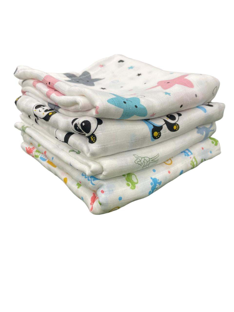 The image shows a neatly stacked pile of soft, white fabric squares with colorful printed designs. These appear to be baby muslin cloths or burp cloths, commonly used for infants.