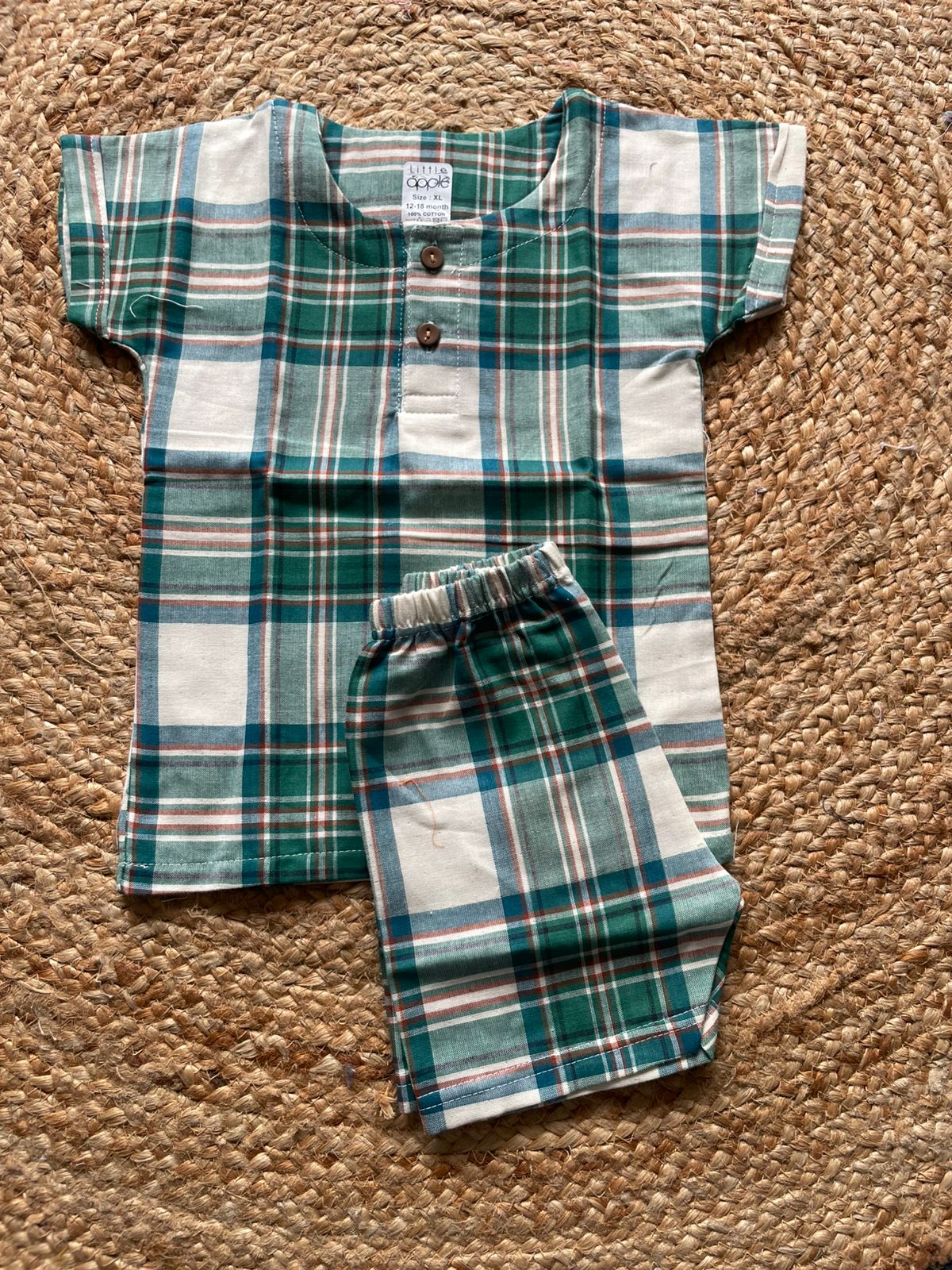 The top is a short-sleeved shirt with a plaid/checkered pattern.