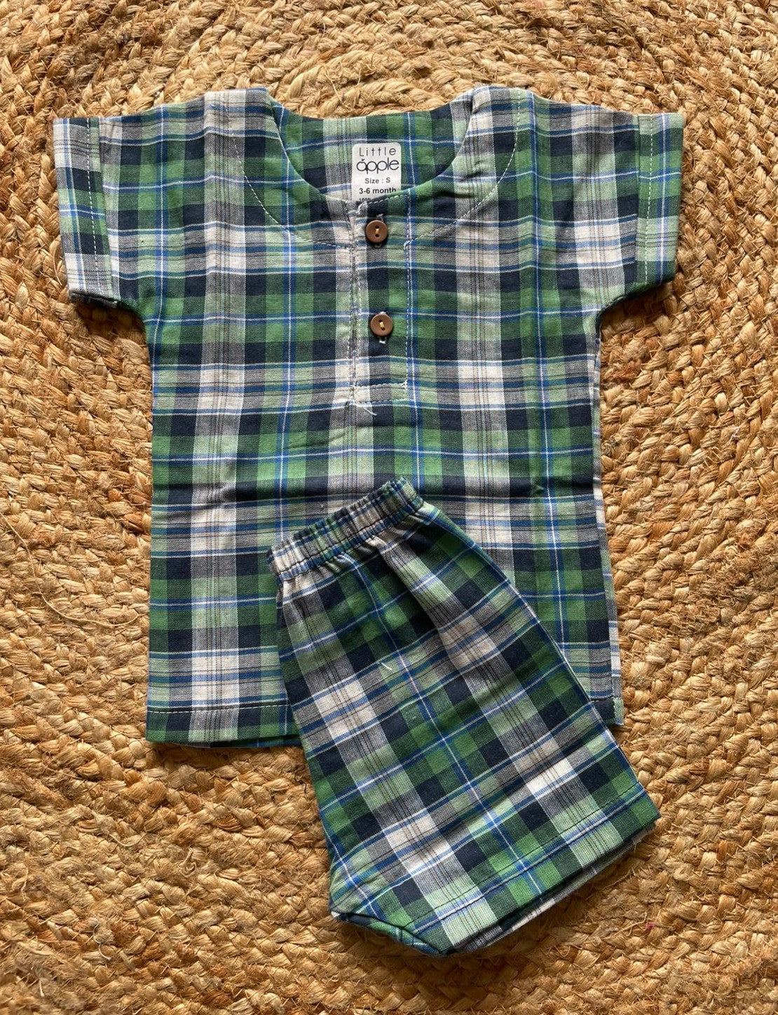The top is a short-sleeved shirt with a plaid/checkered pattern.