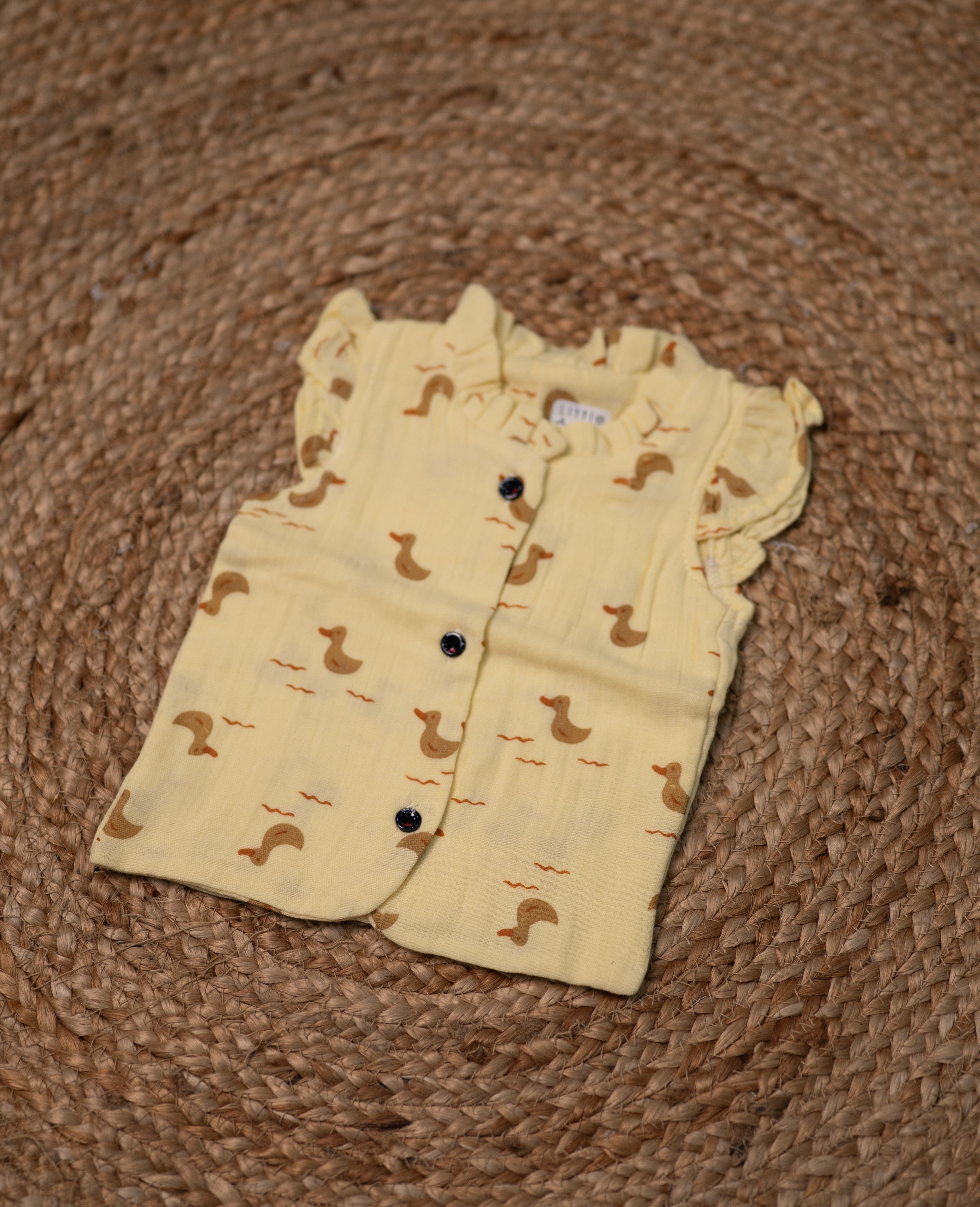 Sleeves: Ruffled cap sleeves that add a delicate, playful touch.