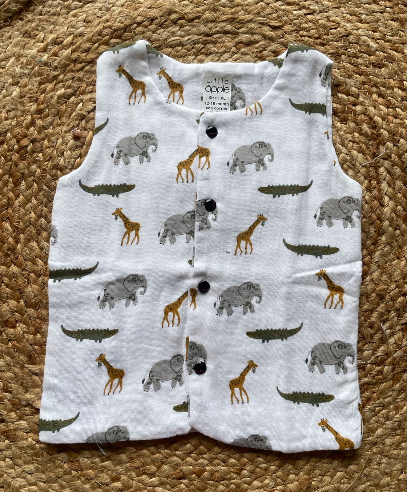 A cute and comfortable baby sleeveless cotton vest designed. Made from 100% soft cotton, this button-down top features a playful ocean-themed print with colorful starfish, shells, snails, fish, and small wave patterns on a light pink background. It has four front buttons for easy dressing and a relaxed fit ideal for warm weather. Perfect for everyday wear, outings, or casual summer days.