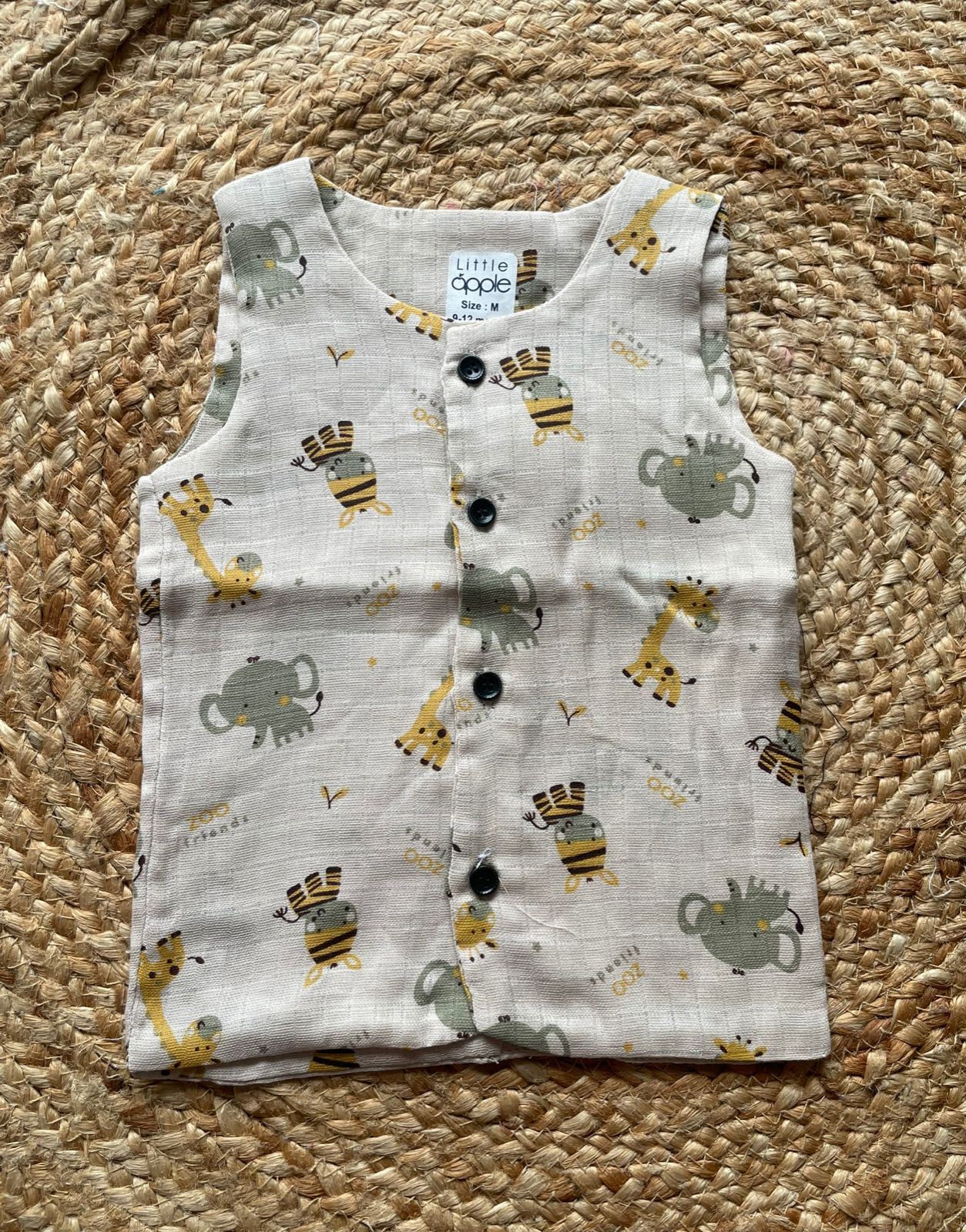 A cute and comfortable baby sleeveless cotton vest designed. Made from 100% soft cotton, this button-down top features a playful ocean-themed print with colorful starfish, shells, snails, fish, and small wave patterns on a light pink background. It has four front buttons for easy dressing and a relaxed fit ideal for warm weather. Perfect for everyday wear, outings, or casual summer days.