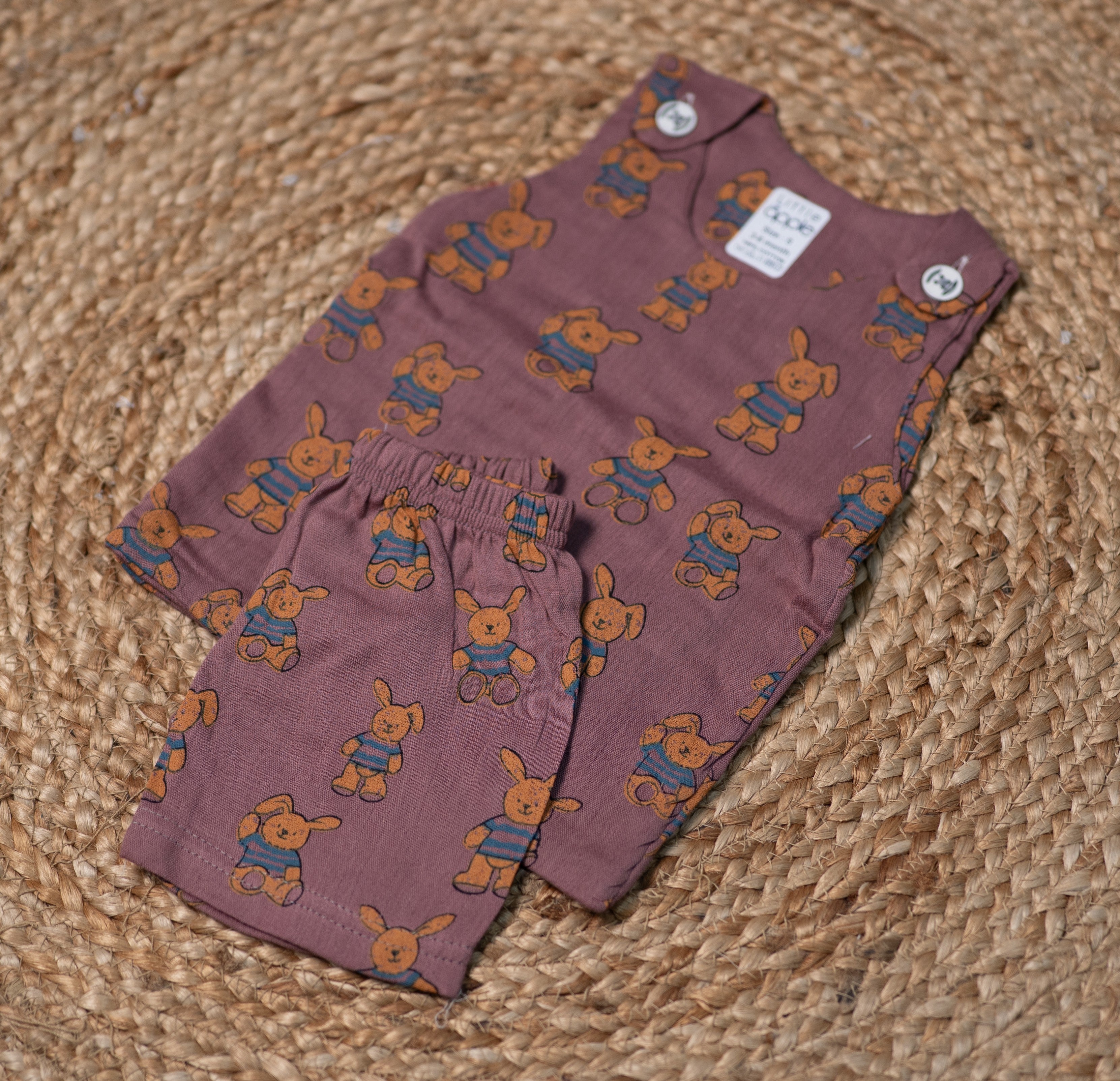 The photo shows a small matching baby outfit laid out on a woven, natural-fiber mat. The outfit consists of a sleeveless top and a pair of elastic-waist shorts. Both pieces are made from a soft-looking white fabric printed with a cute repeating pattern of green trees and little yellow birds with red feet. The top has a couple of buttons down the front and a tag that reads “little dobe.” The overall look is light, playful, and perfect for warm weather.
