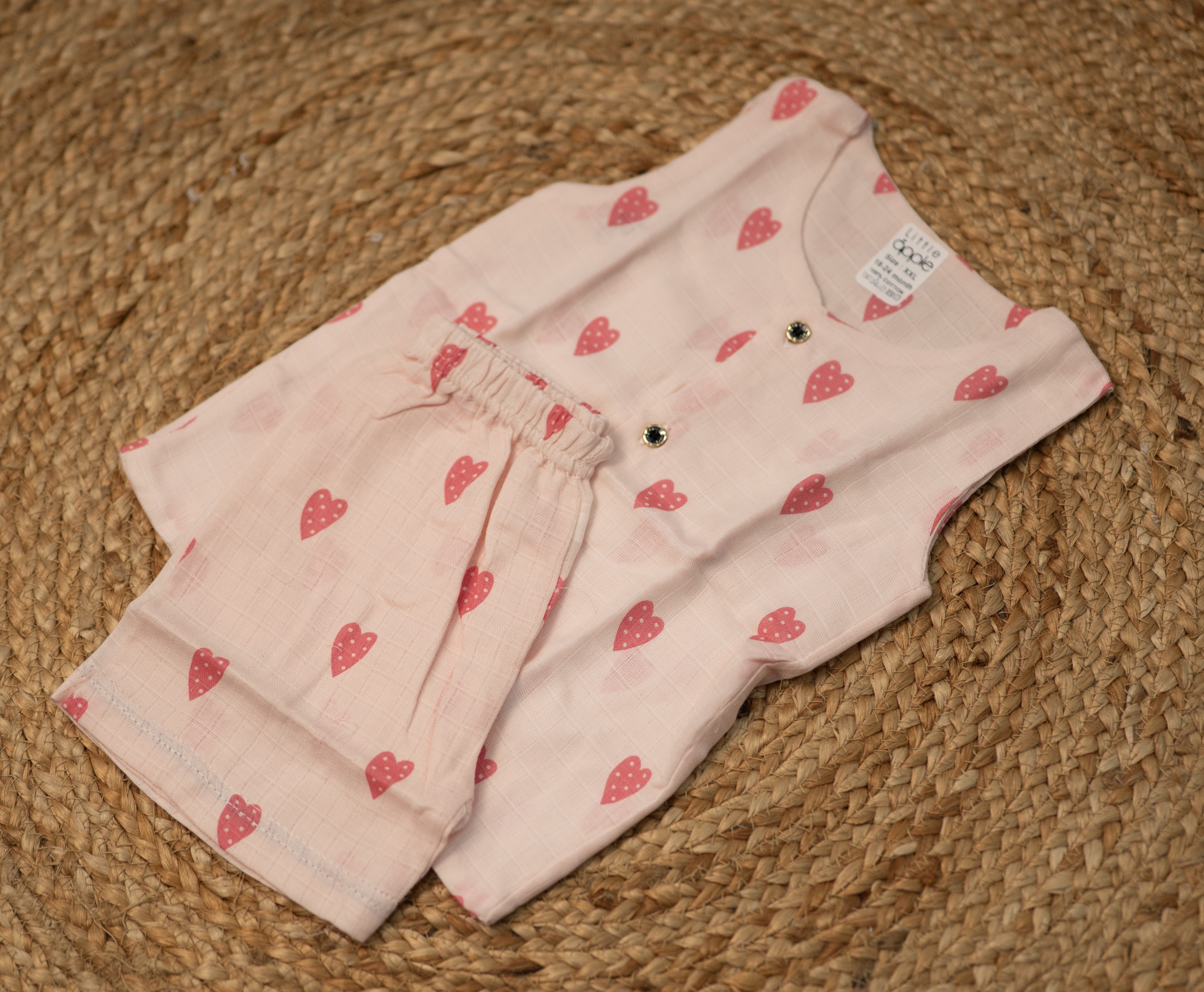 The photo shows a small matching baby outfit laid out on a woven, natural-fiber mat. The outfit consists of a sleeveless top and a pair of elastic-waist shorts. Both pieces are made from a soft-looking white fabric printed with a cute repeating pattern of green trees and little yellow birds with red feet. The top has a couple of buttons down the front and a tag that reads “little dobe.” The overall look is light, playful, and perfect for warm weather.