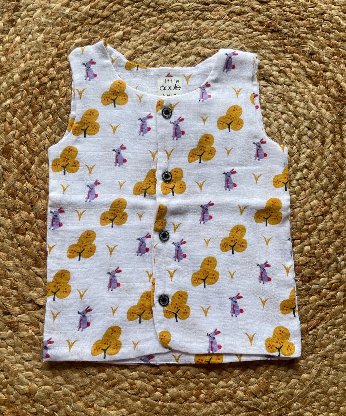 A cute and comfortable baby sleeveless cotton vest designed. Made from 100% soft cotton, this button-down top features a playful ocean-themed print with colorful starfish, shells, snails, fish, and small wave patterns on a light pink background. It has four front buttons for easy dressing and a relaxed fit ideal for warm weather. Perfect for everyday wear, outings, or casual summer days.