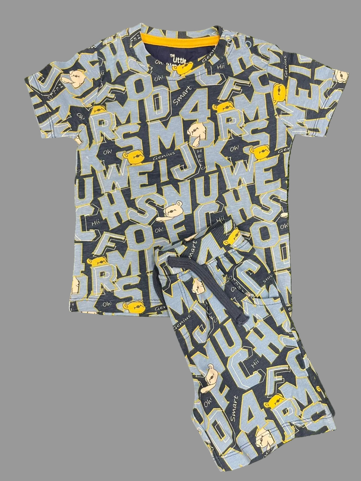 The bottom is a pair of blue shorts made from comfortable cotton material. They have an elastic waistband with a drawstring, ensuring a secure and adjustable fit. The letter print on the leg adds a stylish and confident touch. The shorts are ideal for active play and everyday use.