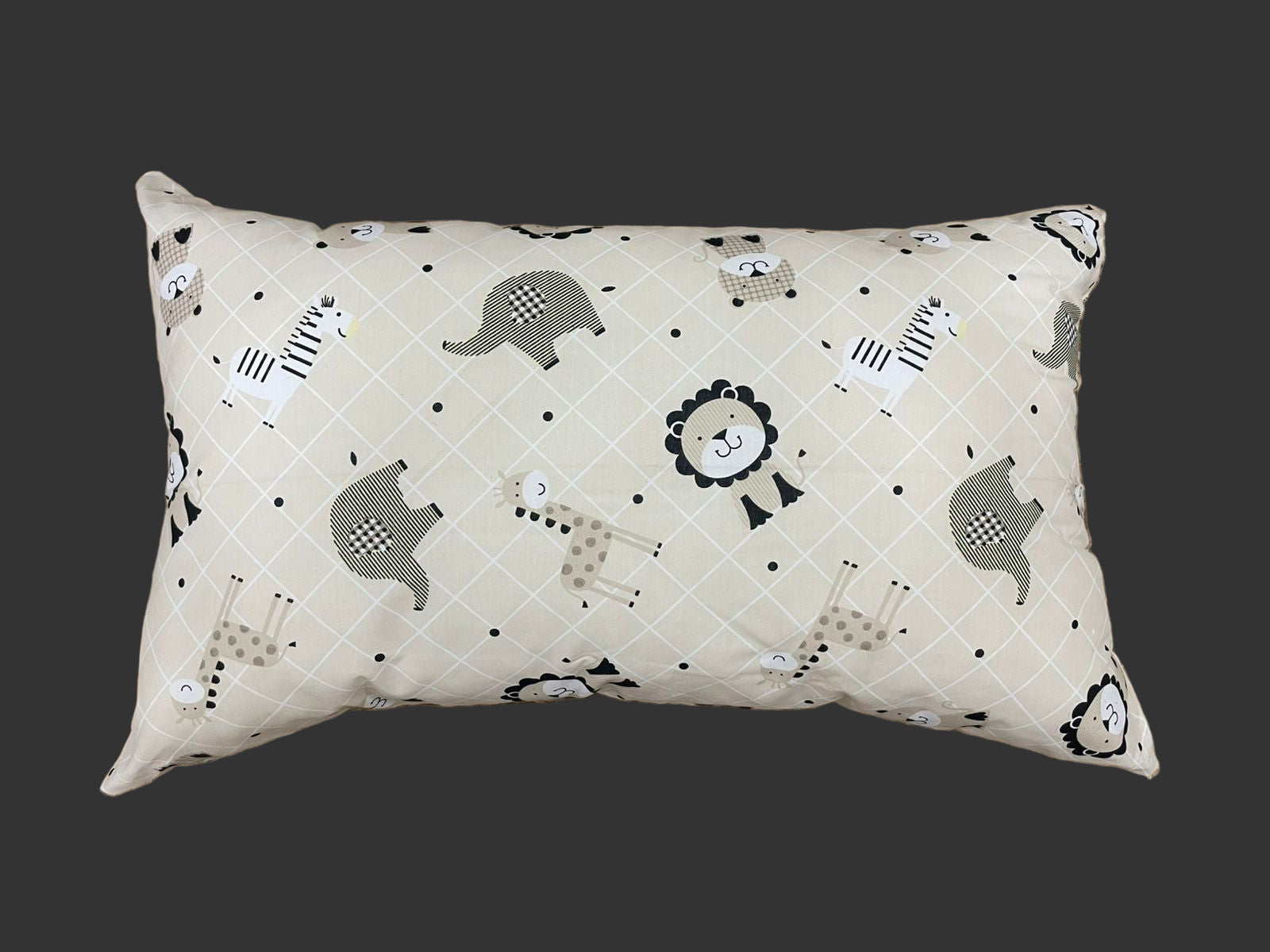 The image shows a rectangular pillow laid on top of a round, woven jute rug. The pillow has a light beige background with a soft grid pattern. Scattered across the pillow are cute, cartoon-style safari animals, including: