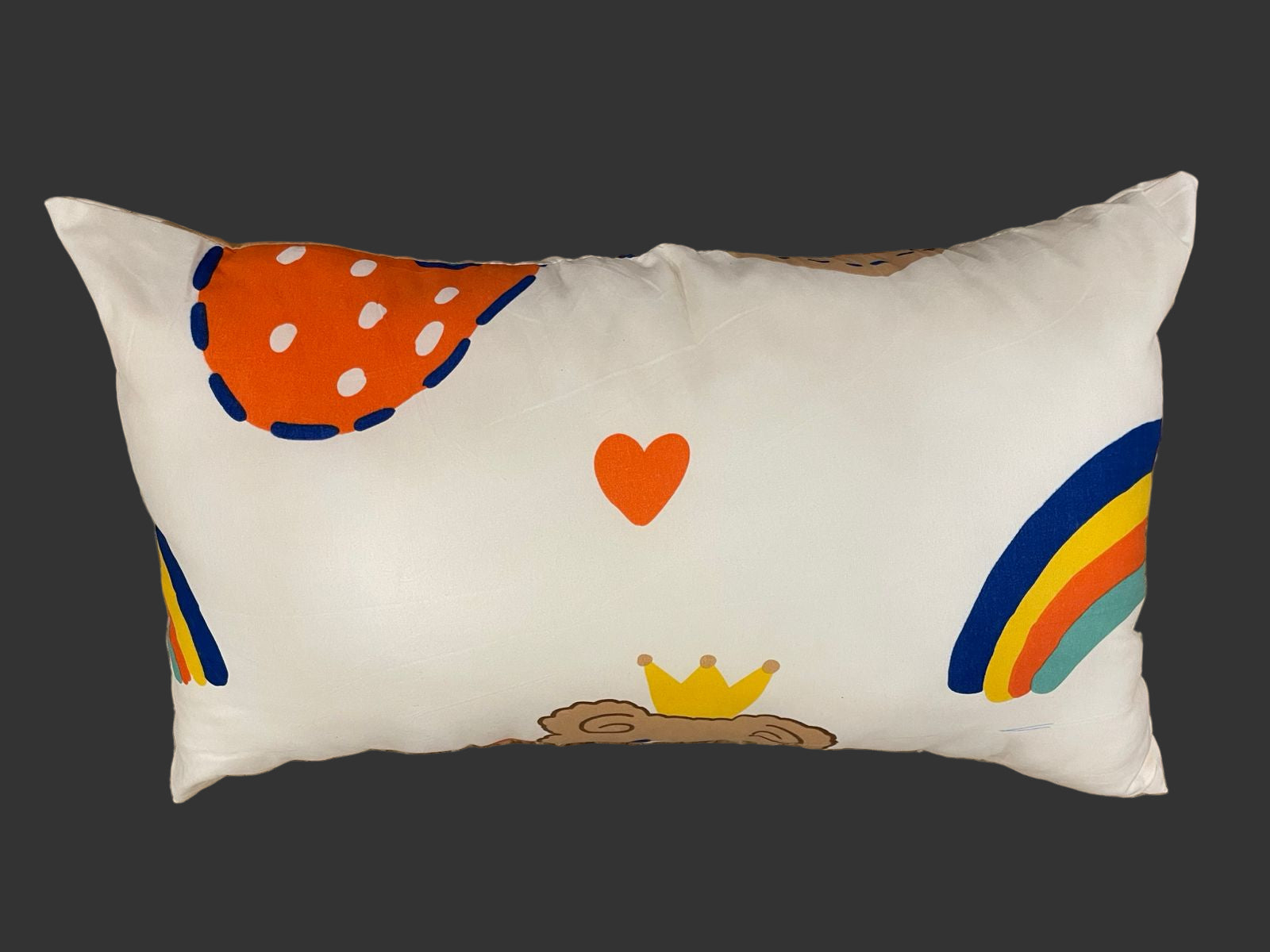 The image shows a rectangular pillow placed on a woven jute mat. The pillow has a creamy white background with a colorful, playful design. Only parts of the design are visible due to the pillow's positioning, but you can see: